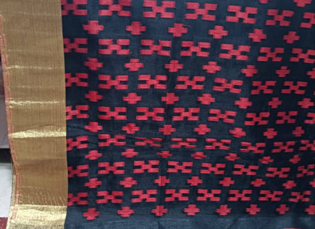 Saree is classic black contemporary design with a net pallu having red woven geometric pattern.
