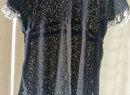 Kaftan style lace dress with cute white tassels. it is free size up to 54". has a tie at the wait as shown in pics. V neck.
